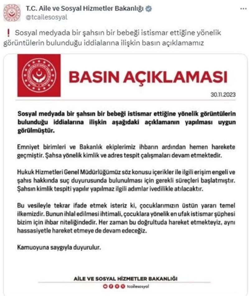 "Emniyet birimleri ve Bakanlık ekiplerimiz ihbarın ardından hemen harekete geçmiştir. Şahsa yönelik kimlik ve adres tespit çalışmaları devam etmektedir. Hukuk Hizmetleri Genel Müdürlüğümüz söz konusu içerikler ile ilgili erişim engeli ve şahıs hakkında suç duyurusunda bulunulması için gerekli süreçleri başlatmıştır.