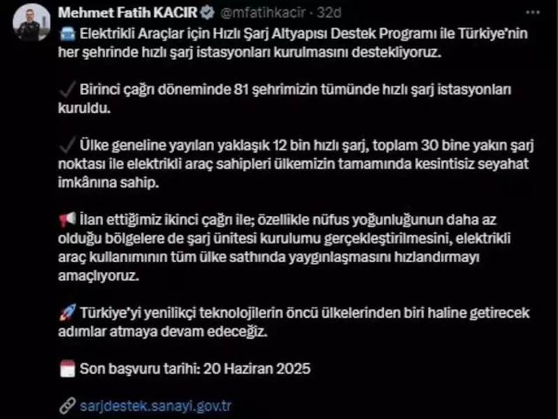 Sanayi ve Teknoloji Bakanı Mehmet Fatih Kacır, elektrikli araç kullanıcılarını sevindirecek önemli bir duyuruda bulundu. Elektrikli Araçlar Hızlı Şarj Altyapısı Destek Programı” kapsamında 2. çağrı dönemi resmen başladı.