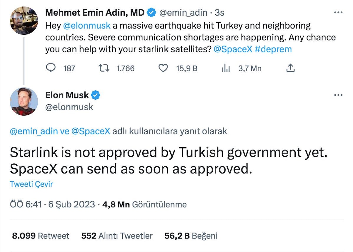 Mehmet Emin Adin, Twitter üzerinen Elon Musk'a “Türkiye ve komşu ülkeleri büyük bir deprem vurdu. Ciddi iletişim eksiklikleri yaşanıyor. Starlink uydularınız için yardım etme şansınız var mı?” diye sordu.