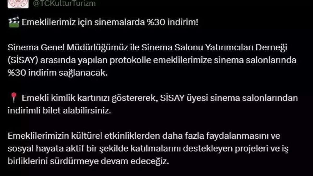 “Emeklilerimiz, emekli kimlik kartlarını ibraz etmeleri şartıyla, SİSAY üyesi sinema salonlarından % 30 indirimli bilet alabilecekler. Bu indirim, emeklilerimizin sosyal hayata daha aktif katılmalarına ve kültürel etkinliklerden daha fazla faydalanmalarına olanak tanıyacak. Emeklilerimizin yaşam kalitesini artırmaya yönelik çalışmaları sürdürecek ve bu tür iş birlikleriyle emeklilerimizin hayatına değer katmaya devam edeceğiz.”