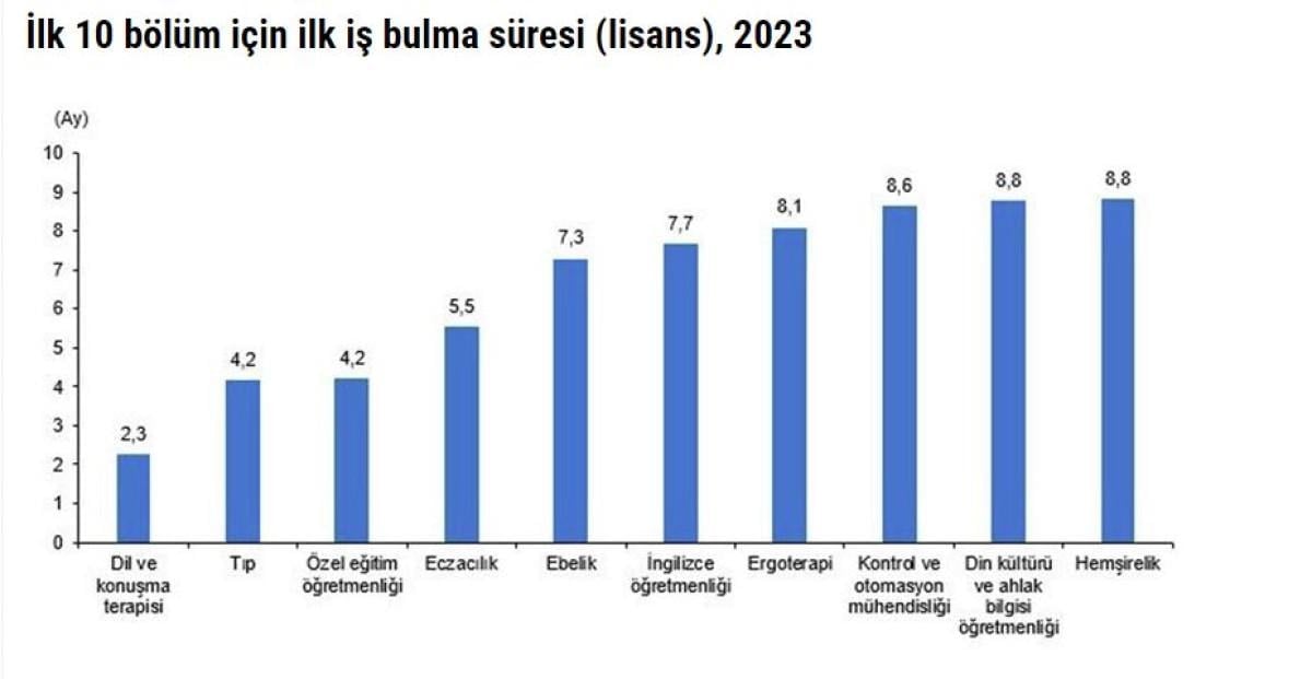 İlk iş bulma süresinin en kısa olduğu lisans bölümleri arasında dikkat çekenler ise dil ve konuşma terapisi (2,3 ay), tıp (4,2 ay), özel eğitim öğretmenliği (4,2 ay), eczacılık (5,5 ay) ve ebelik (7,3 ay) oldu.