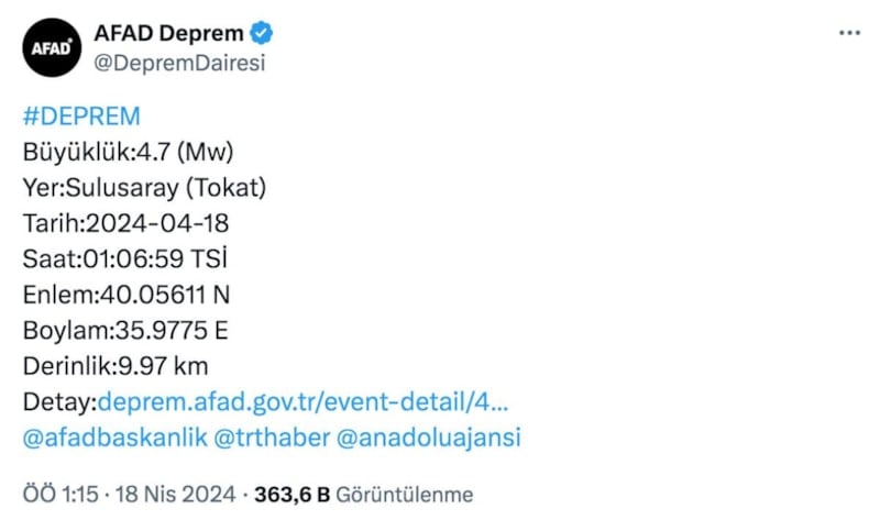 AFAD, Tokat'ta Türkiye saati ile 01:06:59'da 4.7 büyüklüğünde bir deprem meydana geldiğini duyurdu. Depremin derinliği 9.97 km olarak açıklandı.