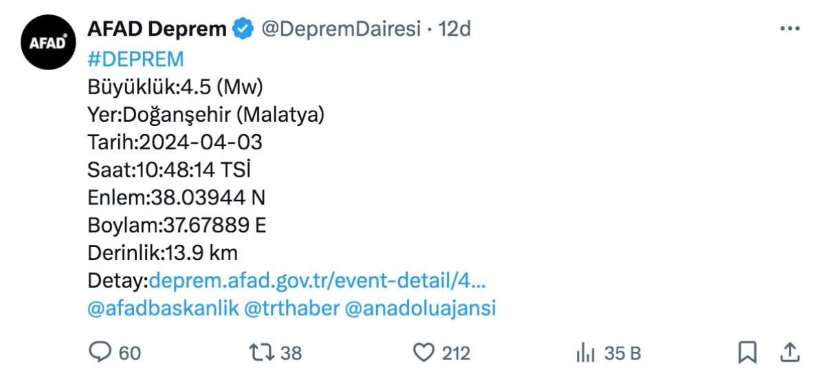 AFAD, Malatya'da Türkiye saati ile 10:48:14'te 4.5 büyüklüğünde bir deprem meydana geldiğini duyurdu. Depremin derinliği 13.9 km olarak açıklandı.