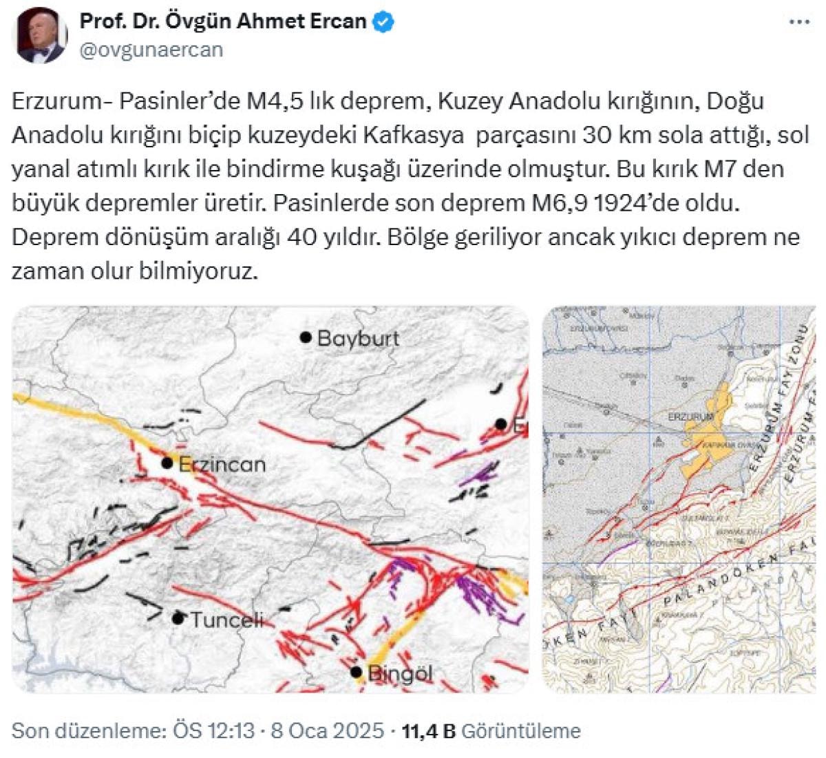 Yaşanan depremlerin ardından sosyal medya platformu olan X hesabı üzerinden paylaşımlar yapan Ercan, Pasinler’de gerçekleşen deprem hakkında yaptığı değerlendirme ile dikkat çekti.