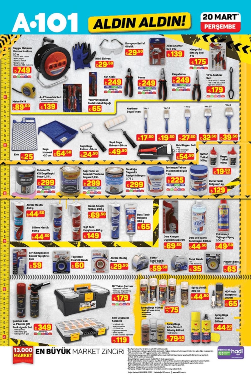 A101 20 Mart Perşembe tarihli afişte boya malzemeler ve tadilat ürünleri bulunuyor.