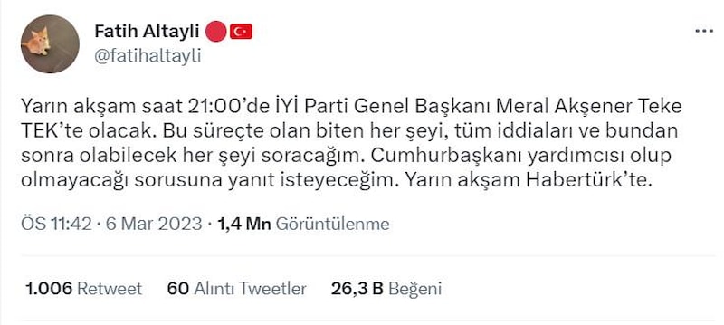 Fatih Altaylı dün yaptığı paylaşım ile Meral Akşener'in programa katılacağını açıkladı. Fatih Altaylı "Yarın akşam saat 21:00’de İYİ Parti Genel Başkanı Meral Akşener Teke TEK’te olacak. Bu süreçte olan biten her şeyi, tüm iddiaları ve bundan sonra olabilecek her şeyi soracağım. Cumhurbaşkanı yardımcısı olup olmayacağı sorusuna yanıt isteyeceğim. Yarın akşam Habertürk’te." ifadelerine yer verdi.