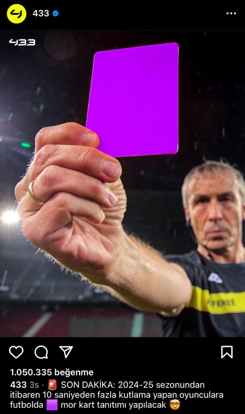 Sosyal medyada 433 sayfasının haberine göre; 2024-2025 sezonundan itibaren 10 saniyeden fazla kutlama yapan oyunculara futbolda mor kart tanıtımı yapılacak.