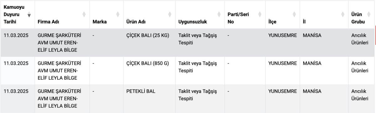 Bakanlık tarafından 11 Mart’ta yayımlanan listede, GURME ŞARKÜTERİ AVM UMUT EREN-ELİF LEYLA BİLGE firmasına ait çiçek balı ve petekli balda hile tespit edildi.