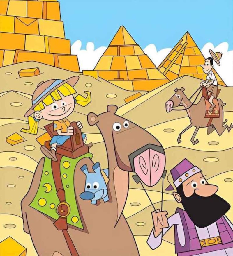 Arka planda piramitler görülürken, ön planda deveye binen turistler görülüyor.