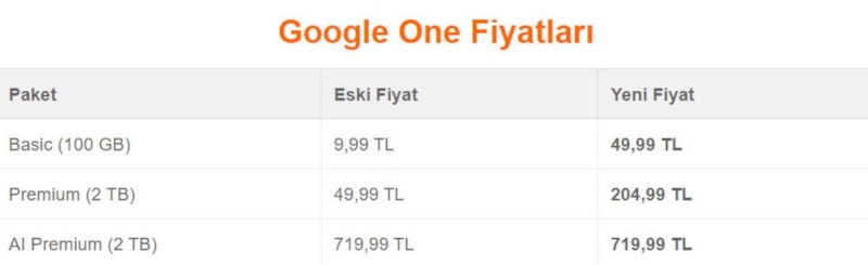 Yapay zeka destekli AI Premium (2 TB) planı ise 719,99 TL olarak sabit kaldı.