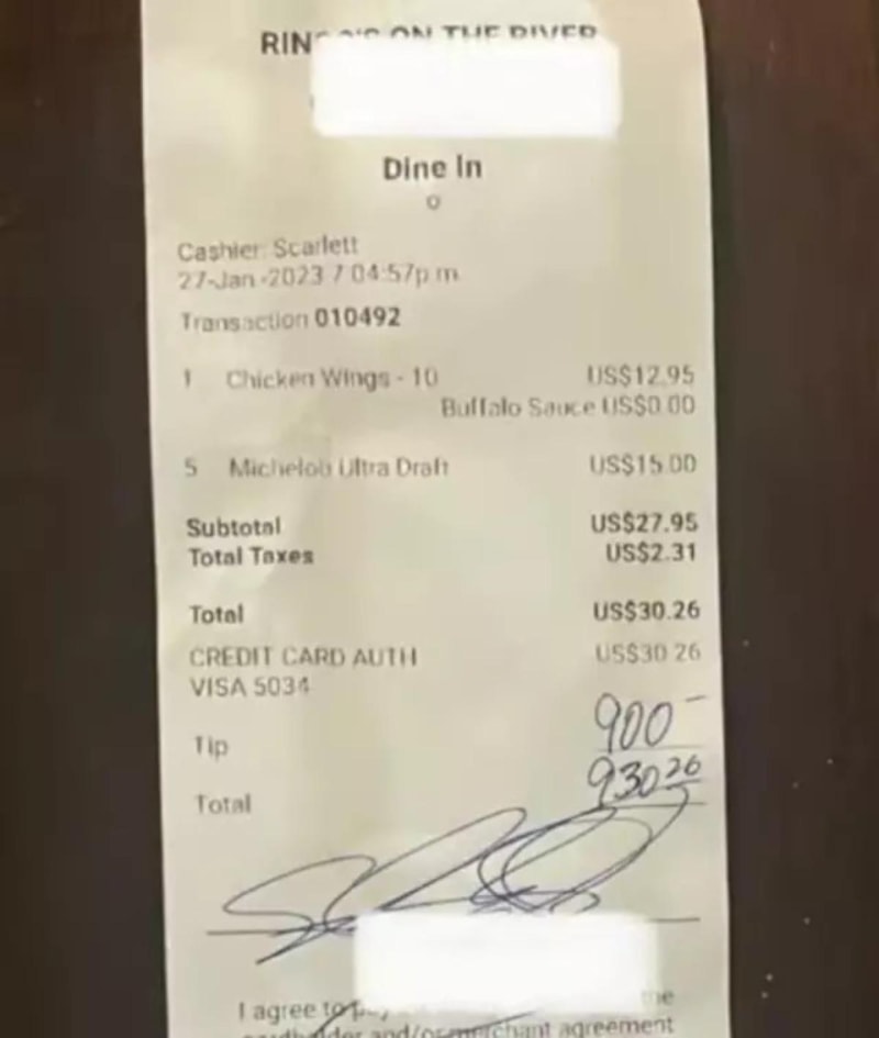 Bahşiş olarak ise hesabın %20'si olan 6.05 dolar (195 TL) ödemesi bekleniyordu. Ancak müşteri fotoğraf çekim ücretini de eklediğini söyleyerek tam 900 dolarlık bir bahşiş bıraktı.
