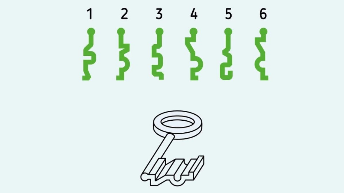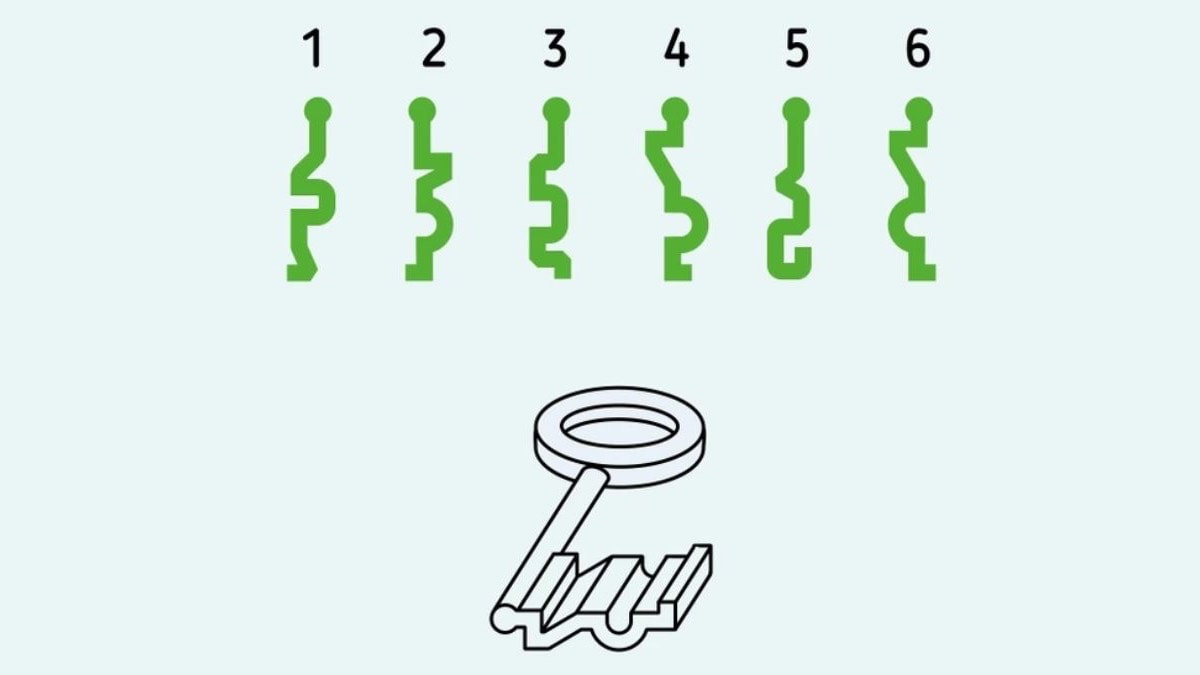 Yukarıdaki resimdeki altı anahtar şeklin tümünü inceleyin. Bunlardan biri, sorudaki anahtarla eşleşiyor.