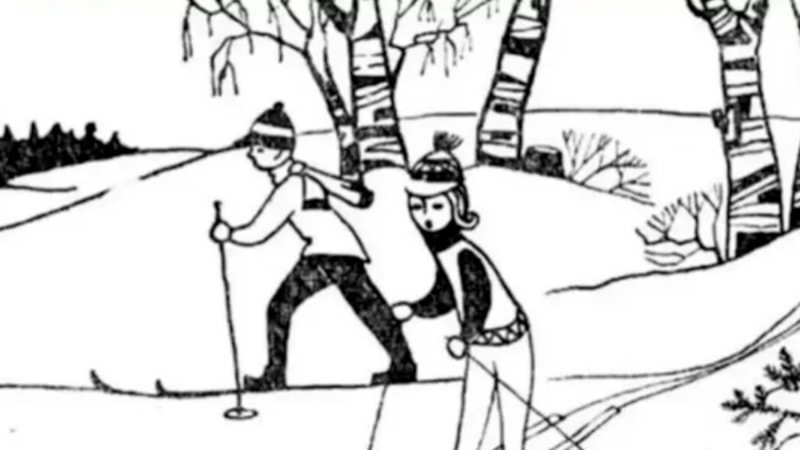 Görselde, karda kayak yapan iki kişinin siyah beyaz çizimini görebiliyoruz. Kadın ve erkek, yünlü şapkalar ve eldivenlerle donatılmış, kayak ekipmanlarıyla hazır bekliyorlar.
