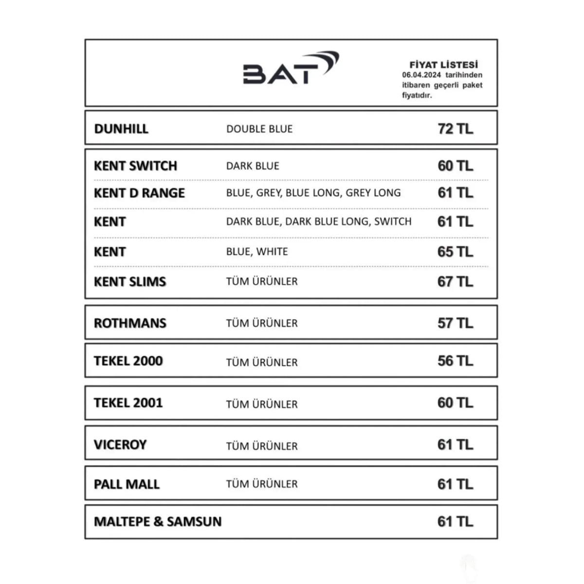 BAT grubu fiyat listesinde herhangi bir değişiklik olmadı. En düşük sigara fiyatı 56 lirayken, en yüksek sigara fiyatı 72 lira. İşte diğer fiyatlar:
