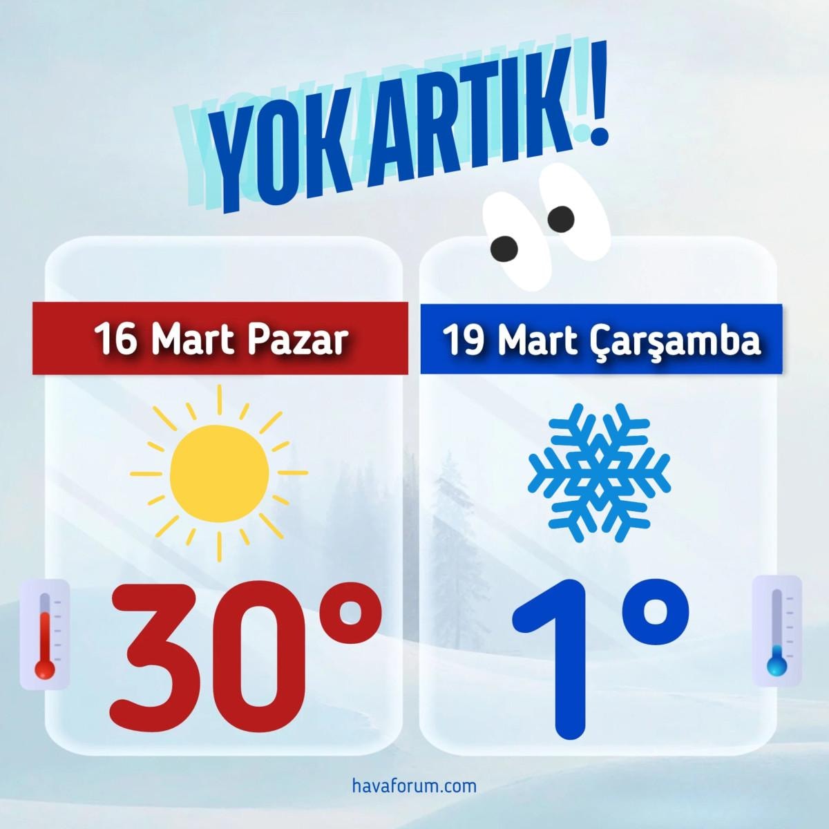 Hava Forum'a göre, "Yeni haftada Poyraz, balyozunu sertçe vurup sıcaklıkları 25-30 derece birden düşürecek. Birçok şehir kar potasına girecek.