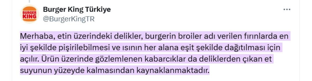 "Etin üzerindeki delikler, burgerin broiler adı verilen fırınlarda en iyi şekilde pişirilebilmesi ve ısının her alana eşit şekilde dağıtılması için açılır. Ürün üzerinde gözlemlenen kabarcıklar da deliklerden çıkan et suyunun yüzeyde kalmasından kaynaklanmaktadır."