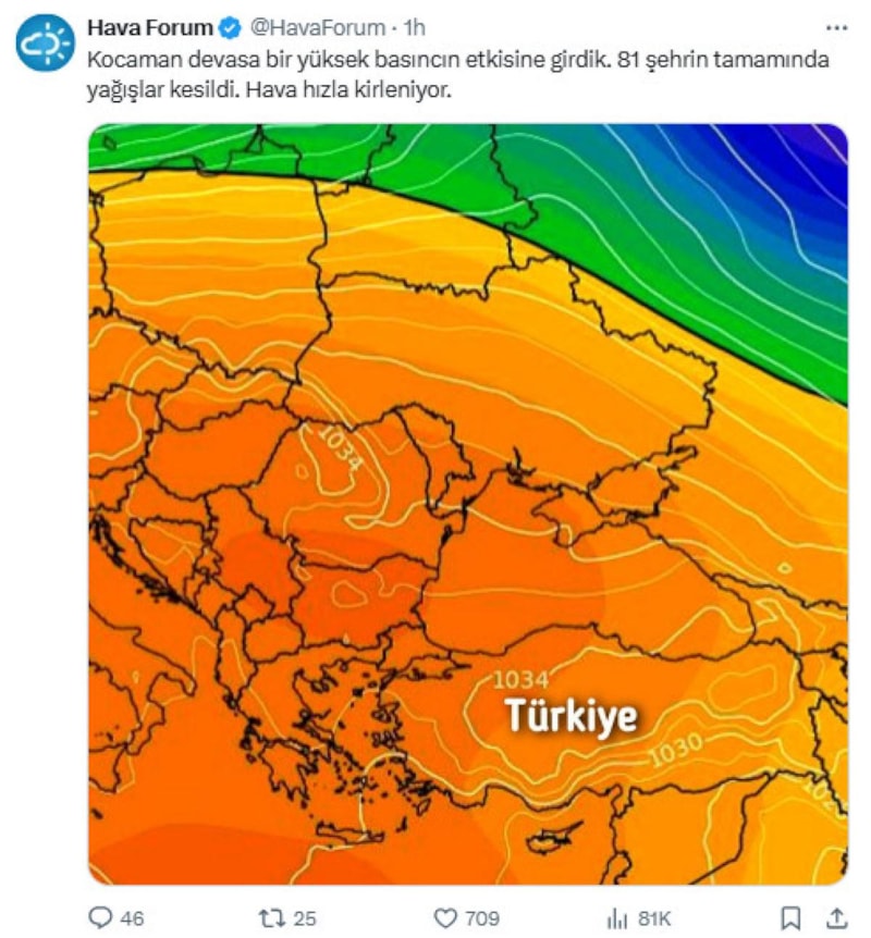 “Kocaman devasa bir yüksek basıncın etkisine girdik. 81 şehrin tamamında yağışlar kesildi. Hava hızla kirleniyor.”