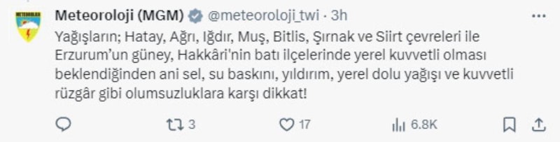 "Yağışların; Hatay, Ağrı, Iğdır, Muş, Bitlis, Şırnak ve Siirt çevreleri ile Erzurum’un güney, Hakkâri'nin batı ilçelerinde yerel kuvvetli olması beklendiğinden ani sel, su baskını, yıldırım, yerel dolu yağışı ve kuvvetli rüzgâr gibi olumsuzluklara karşı dikkat!"