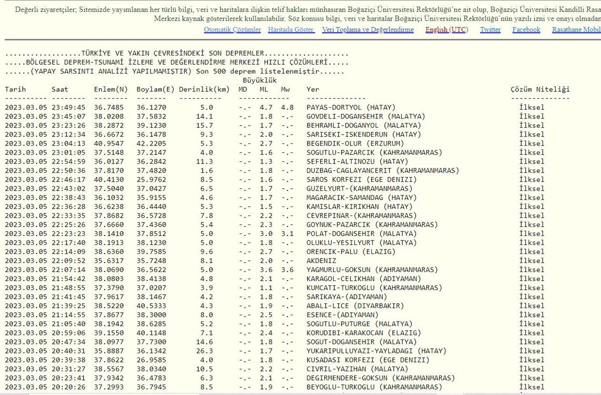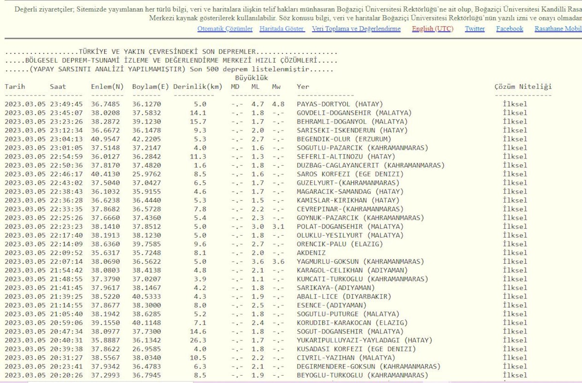 İşte Kandilli Rasathanesi'nin 5 Mart 2023 deprem verileri: