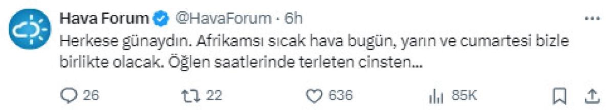“Herkese günaydın. Afrikamsı sıcak hava bugün, yarın ve cumartesi bizle birlikte olacak. Öğlen saatlerinde terleten cinsten...”
