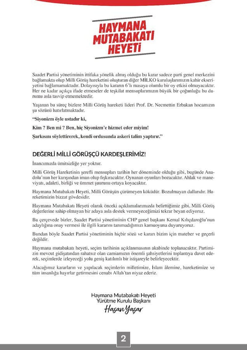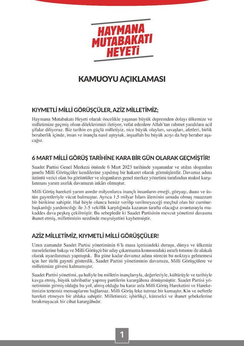 Uzun zamandır Saadet Partisi yönetiminin 6'lı masa içerisindeki duruşu, dünya ve ülkemiz meselelerine bakışı ve Milli Görüşçü bir aday çıkarmama konusundaki ısrarlı tutumu ile alakalı olarak uyarılarımızı yapmıştık.Bu güne kadar davamız adına sürecin bu noktaya gelmemesi için her türlü gayreti gösterdik. Saadet Partisi yönetiminin davamıza, Milli Görüşçülere ve milletimize güveni kalmamıştır.