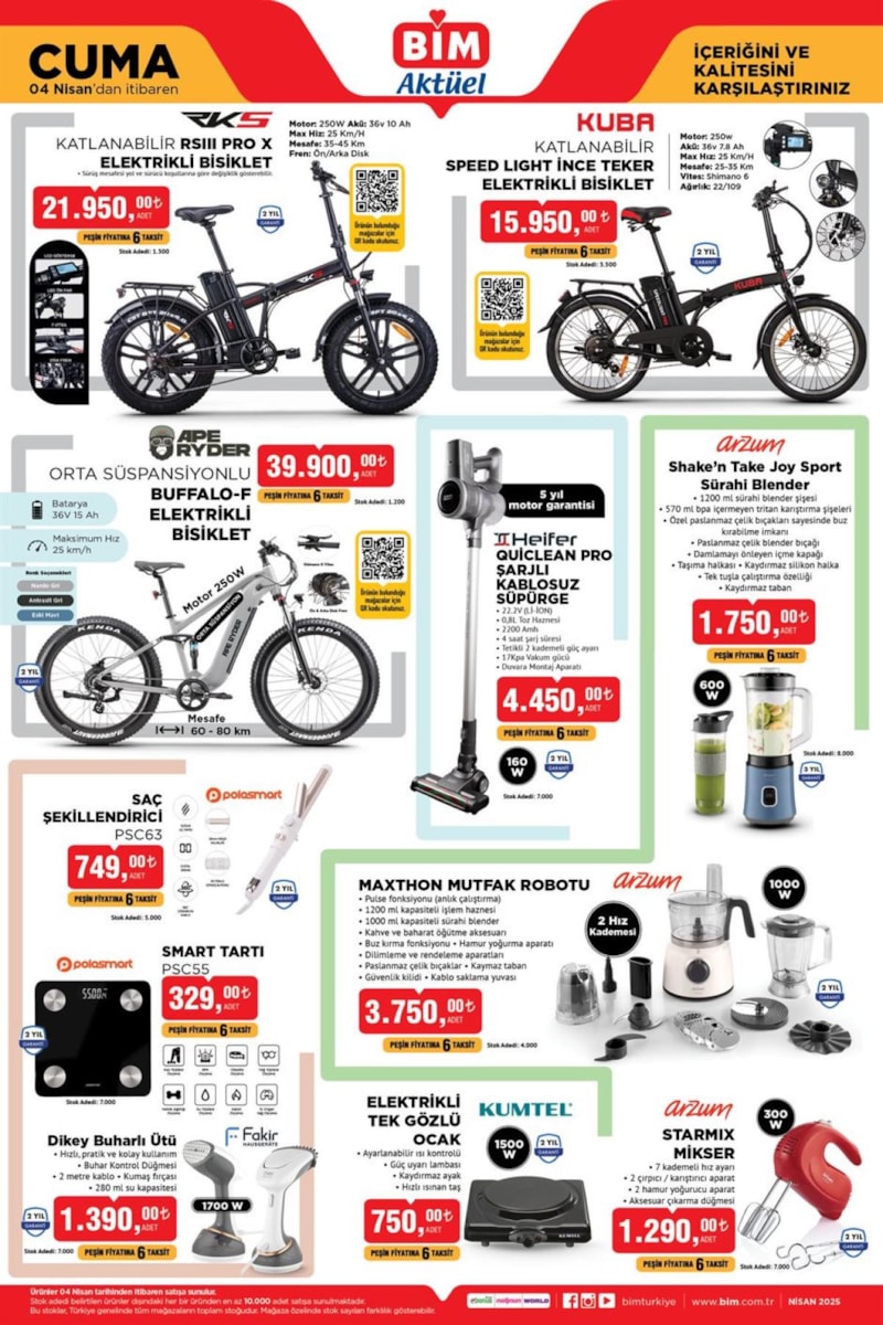ift Kişilik Nevresim Seti, Elektrikli Bisiklet, Heifer Şarjlı Kablosuz Süpürge ve Arzum Mutfak Robotu gibi popüler ürünler de 4 Nisan aktüel kataloğunda yerini alacak.