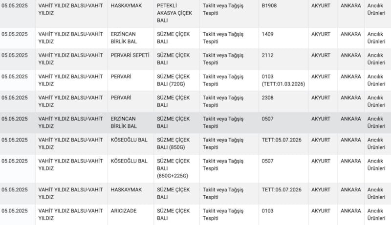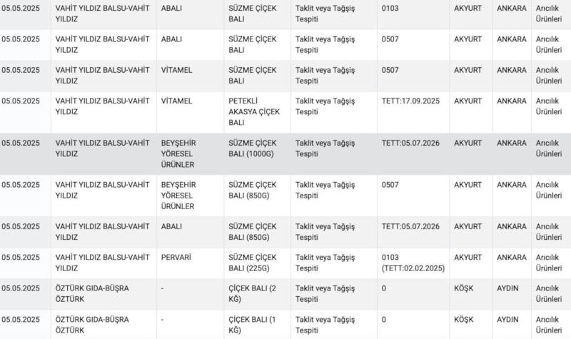 Bakanlığın yayımladığı yeni taklit ve tağşiş listesinde Vahit Yıldız Balsu ve Öztür Gıda firmalarına ait toplamda 9 bal markasında hile tespit edildi.