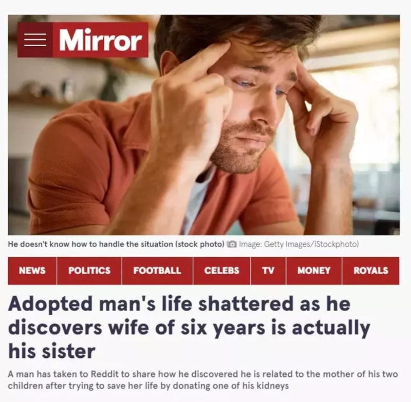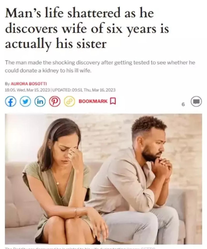 Doktorların bu anlattıklarının ne anlama geldiğini sorgulayan genç adam duydukları karşısında neye uğradığını şaşırdı. Doktorlar, DNA bilgisinin nesiller boyunca nasıl aktarıldığını anlatarak ancak kardeşlerin bu kadar büyük oranda eşleşme gösterebileceğini açıkladı ve genç adama karısının genetik olarak akrabası, büyük ihtimalle de kardeşi olduğunu belirttiler.