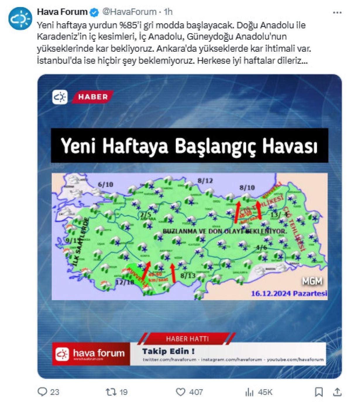 “Yeni haftaya yurdun %85'i gri modda başlayacak. Doğu Anadolu ile Karadeniz'in iç kesimleri, İç Anadolu, Güneydoğu Anadolu'nun yükseklerinde kar bekliyoruz. Ankara'da yükseklerde kar ihtimali var. İstanbul'da ise hiçbir şey beklemiyoruz. Herkese iyi haftalar dileriz...”