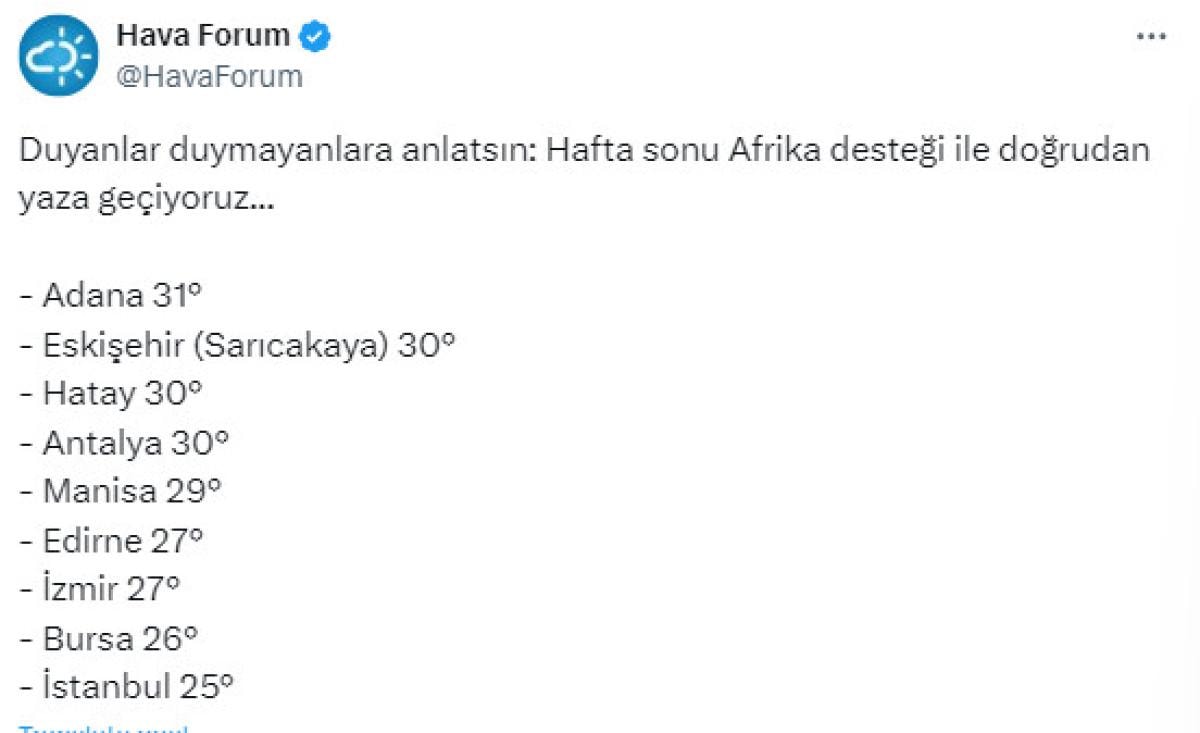 Meteoroloji kaynağı Hava Forum, sosyal medya hesabından hafta sonu yazın gelişini müjdeledi.