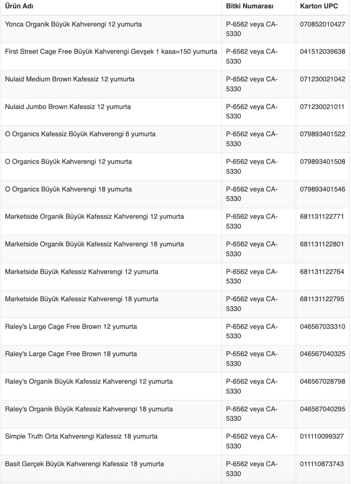 ABD'nin Kaliforniya eyaletinde faaliyet gösteren August Egg Company tarafından, büyük çaplı bir geri çağırma başlatıldı.