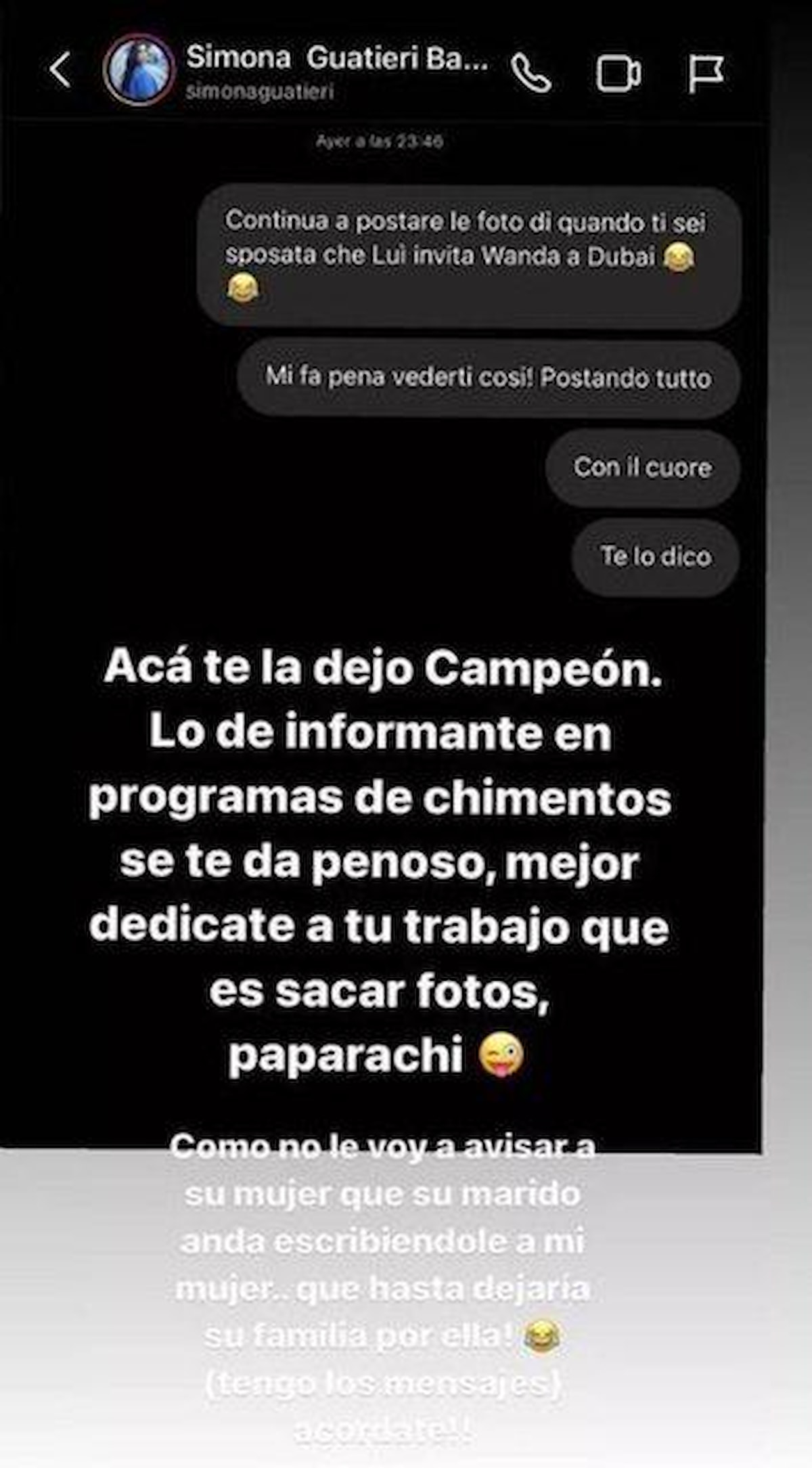 Sosyal medyada yayınlamakta yetinmeyen Icardi, Balde'nin eşine de mesaj attı.