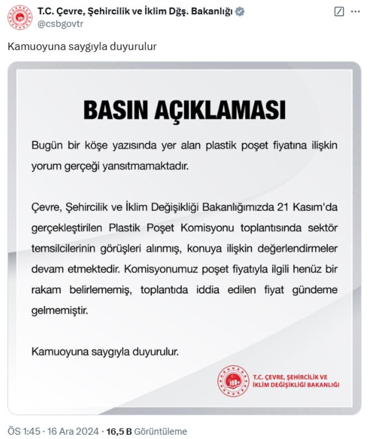 Bakanlığın sosyal medya hesabı üzerinden yapılan bilgilendirmede, “Bugün bir köşe yazısında yer alan plastik poşet fiyatına ilişkin yorum gerçeği yansıtmamaktadır.