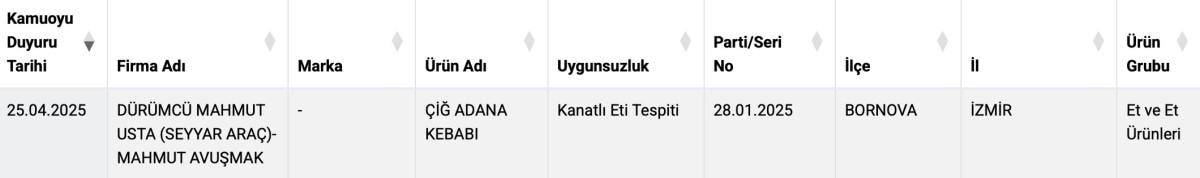 İzmir'de yer alan Dürümcü Mahmut Usta'nın çiğ Adana kebabı ve Ankara'da yer alan Rahmi Usta Dürümce Kebap'ın kuzu şiş ürünlerinde kanatlı eti tespit edildi.