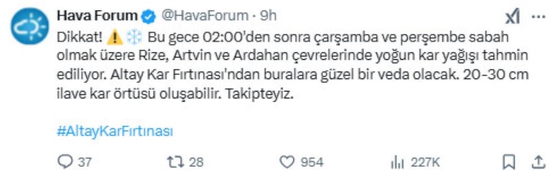 Sosyal medya üzerinden yapılan paylaşımda, “Bu gece 02:00'den sonra çarşamba ve perşembe sabah olmak üzere Rize, Artvin ve Ardahan çevrelerinde yoğun kar yağışı tahmin ediliyor. Altay Kar Fırtınası'ndan buralara güzel bir veda olacak. 20-30 cm ilave kar örtüsü oluşabilir” ifadelerine yer verdi.