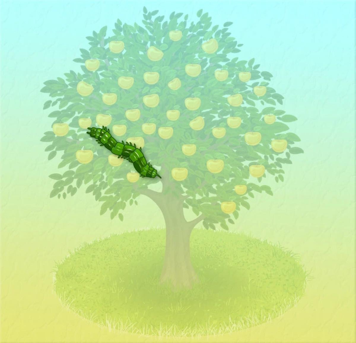 Şimdi, bugün için eğlenceli bir meydan okuma: Bir elma ağacının resmine yakından bakın ve gizli tırtılı bulmaya çalışın.