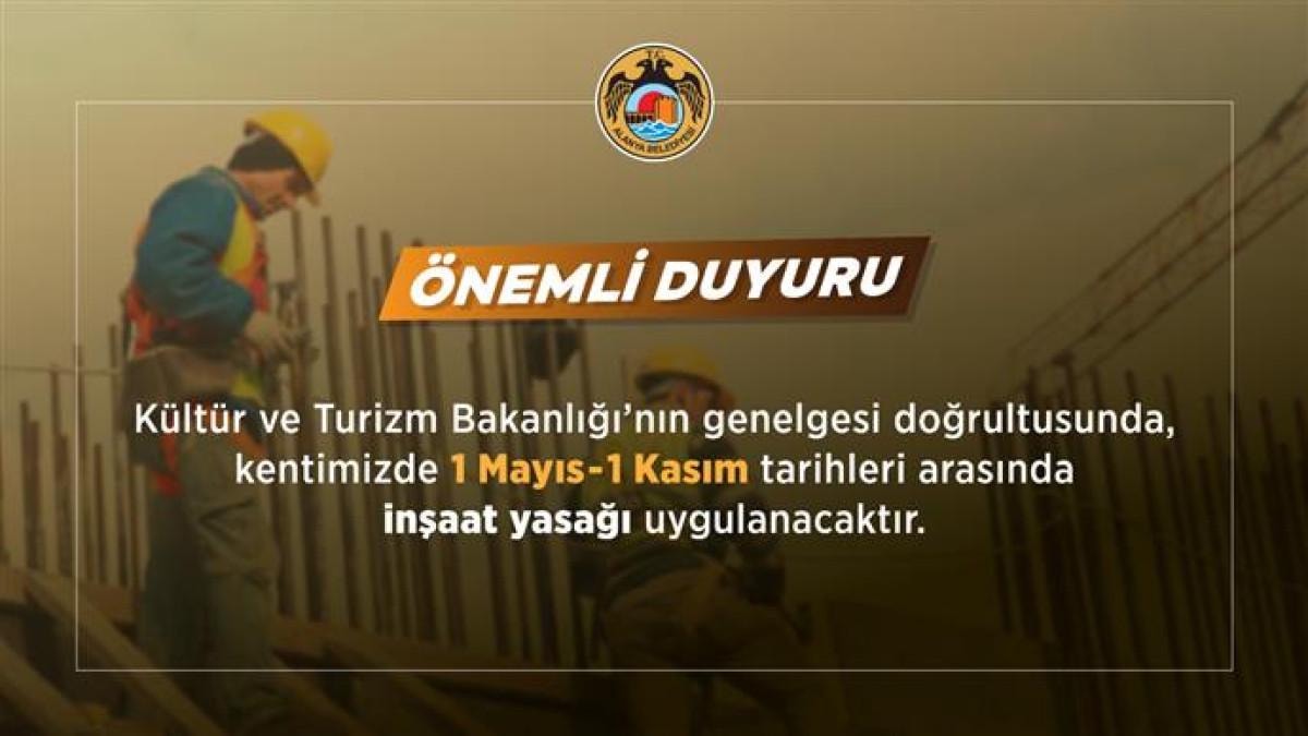 Genelgede, “Ülkemiz turizminin sürdürülebilir niteliğe kavuşturulması ve marka haline getirilip kalıcı niteliğe sahip olmasının sağlanması amacıyla, turizm sezonu olarak nitelendirilen 1 Mayıs – 1 Kasım tarihleri arasında Kültür ve Turizm Bakanlığı’nın İnşaat Yasağı Genelgesi ile inşaat faaliyetlerine kısıtlama getirilmiştir” ifadeleri yer aldı.