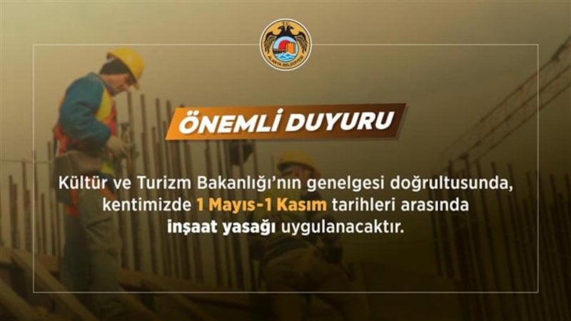 Genelgeye göre Antalya ve Muğla’da 1 Mayıs ile 1 Kasım tarihleri arasında inşaat faaliyetlerine yasak getirildi.