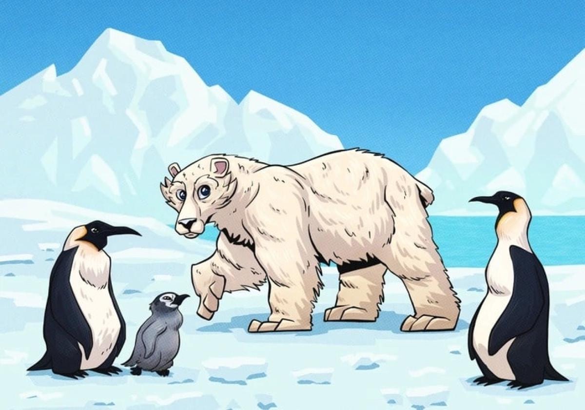 Kutup bölgesinde bir kutup ayısı üç penguenle birlikte görülebilir.