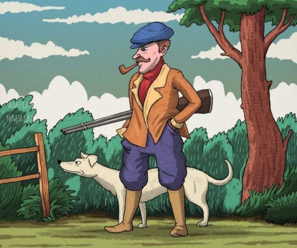 Yukarıdaki resimde avlanan bir avcı var. Köpeği, piposu ve tüfeği var.