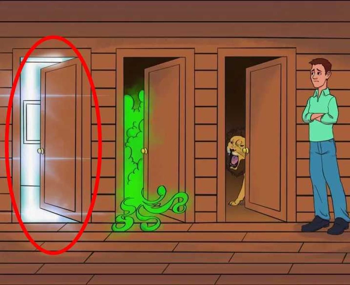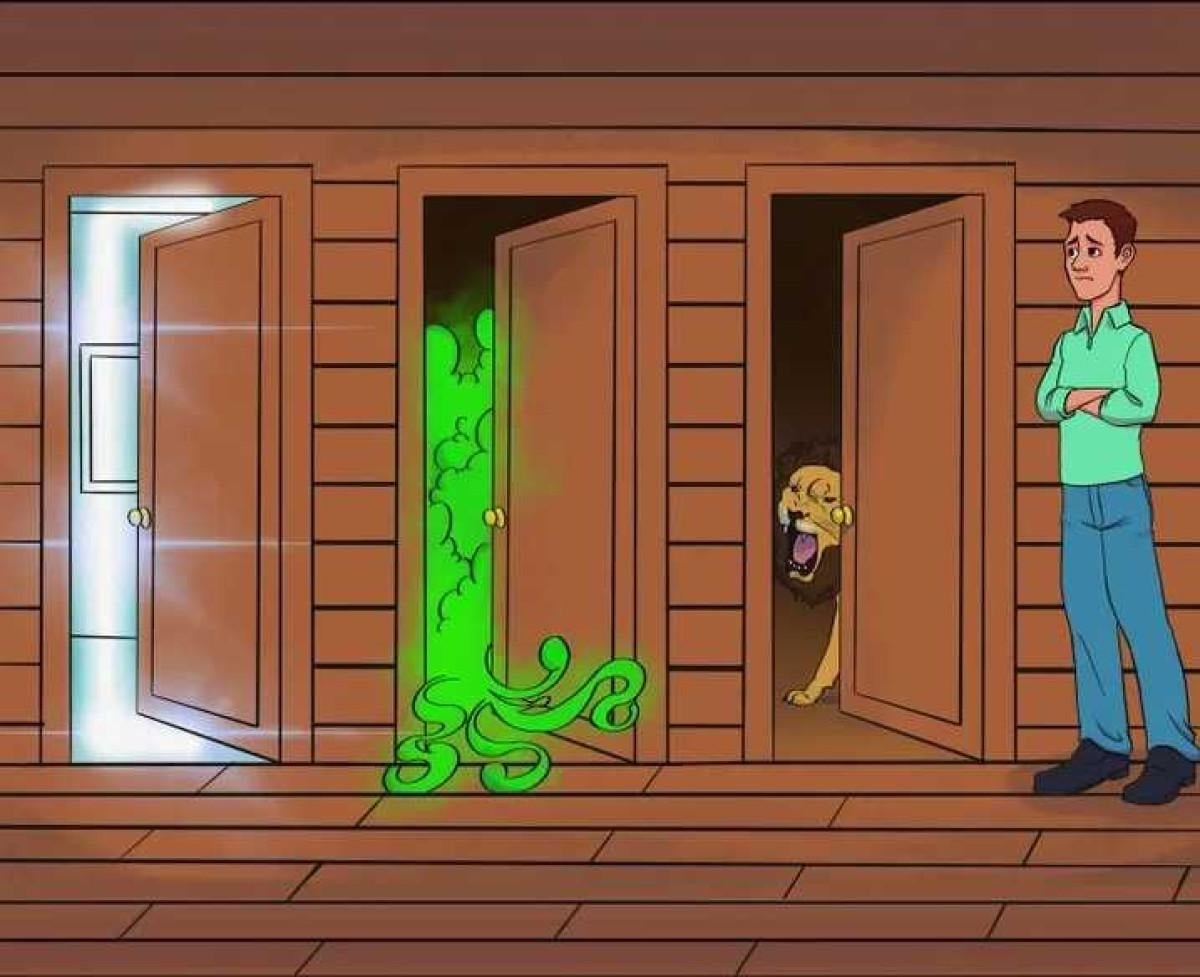 Yukarıda paylaşılan görsel, evde mahsur kalmış bir adamı tasvir ediyor ve önünde üç çıkış var. Kapıların her biri potansiyel bir tehlike barındırıyor ve en güvenli kapıyı akıllıca seçmek zorunda.