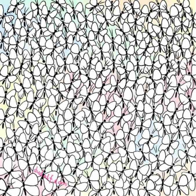 Göz alıcı kelebek desenleriyle dolu bu görselin içine ustalıkla gizlenmiş bir karınca var. Sadece yüksek dikkat seviyesine sahip olanlar onu 5 saniyede bulabiliyor.