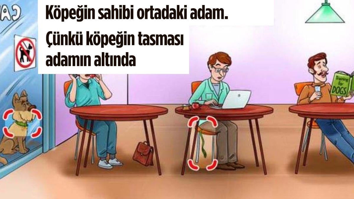 Bu IQ testinde kafe önünde bekleyen bir köpek var. Bu köpeğin sahibi ise içeride oturuyor. Peki bu 3 adamdan hangisi köpeğin sahibi?