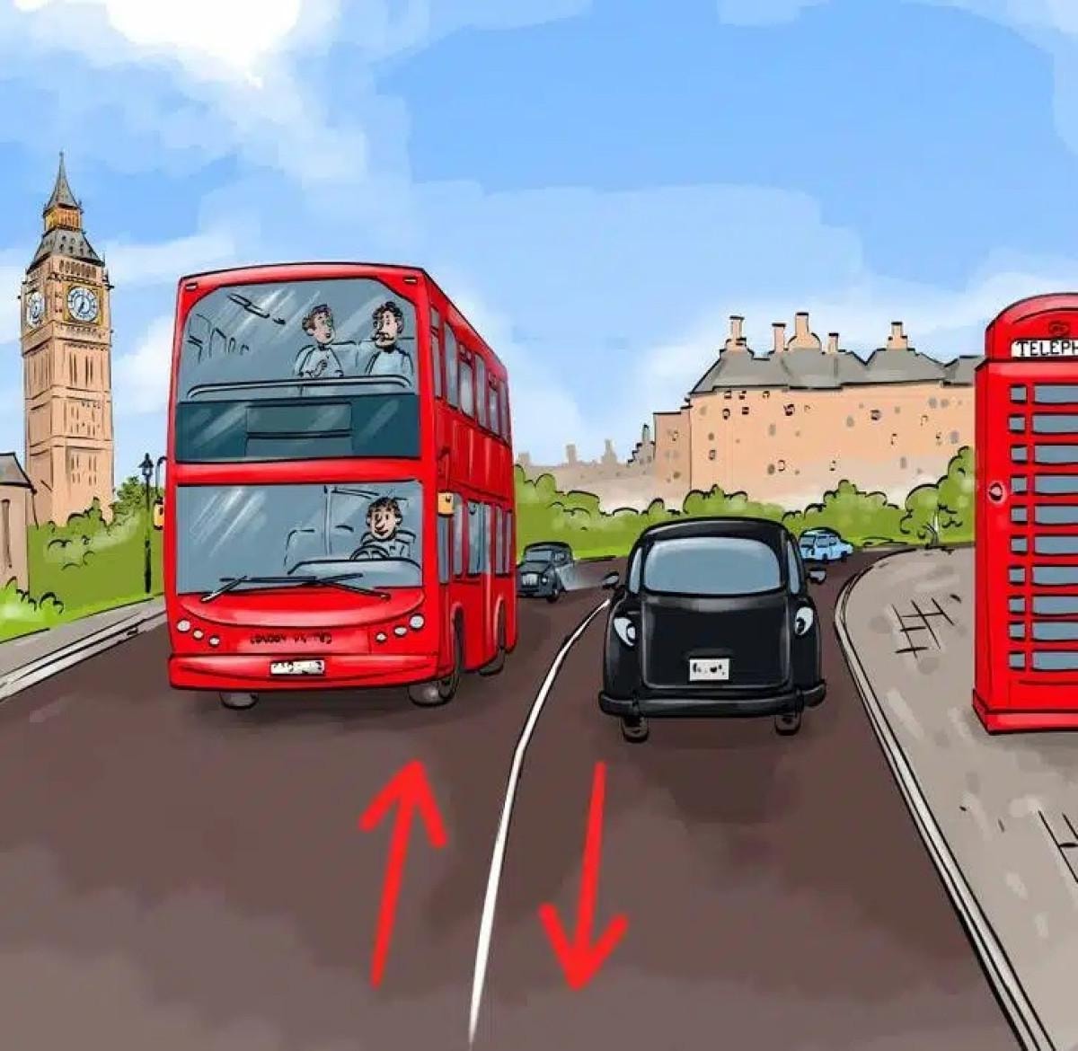 Arka planda büyük bir otobüs var, Londra'da bir okul otobüsü trafikte, yayalar yürüyor... Ama tekrar ve biraz daha dikkatli bakarsanız, resimde çok büyük bir hatanın gizli olduğunu fark edeceksiniz.