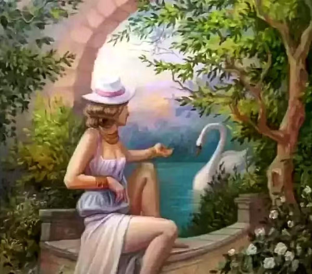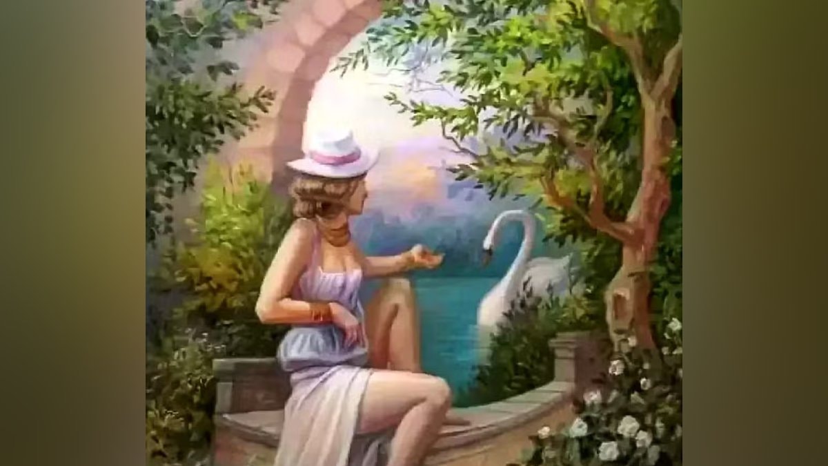 Yukarıdaki resimde bir kuğuyu seyreden kadın yer alıyor. Ancak kadın yalnız değil.