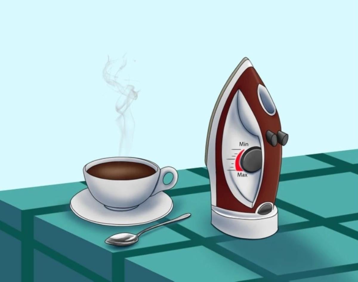 Resimde bir fincan sıcak kahveyi bir fincan tabağına yerleştiriyoruz. Fincanın yanında bir de ütü var.