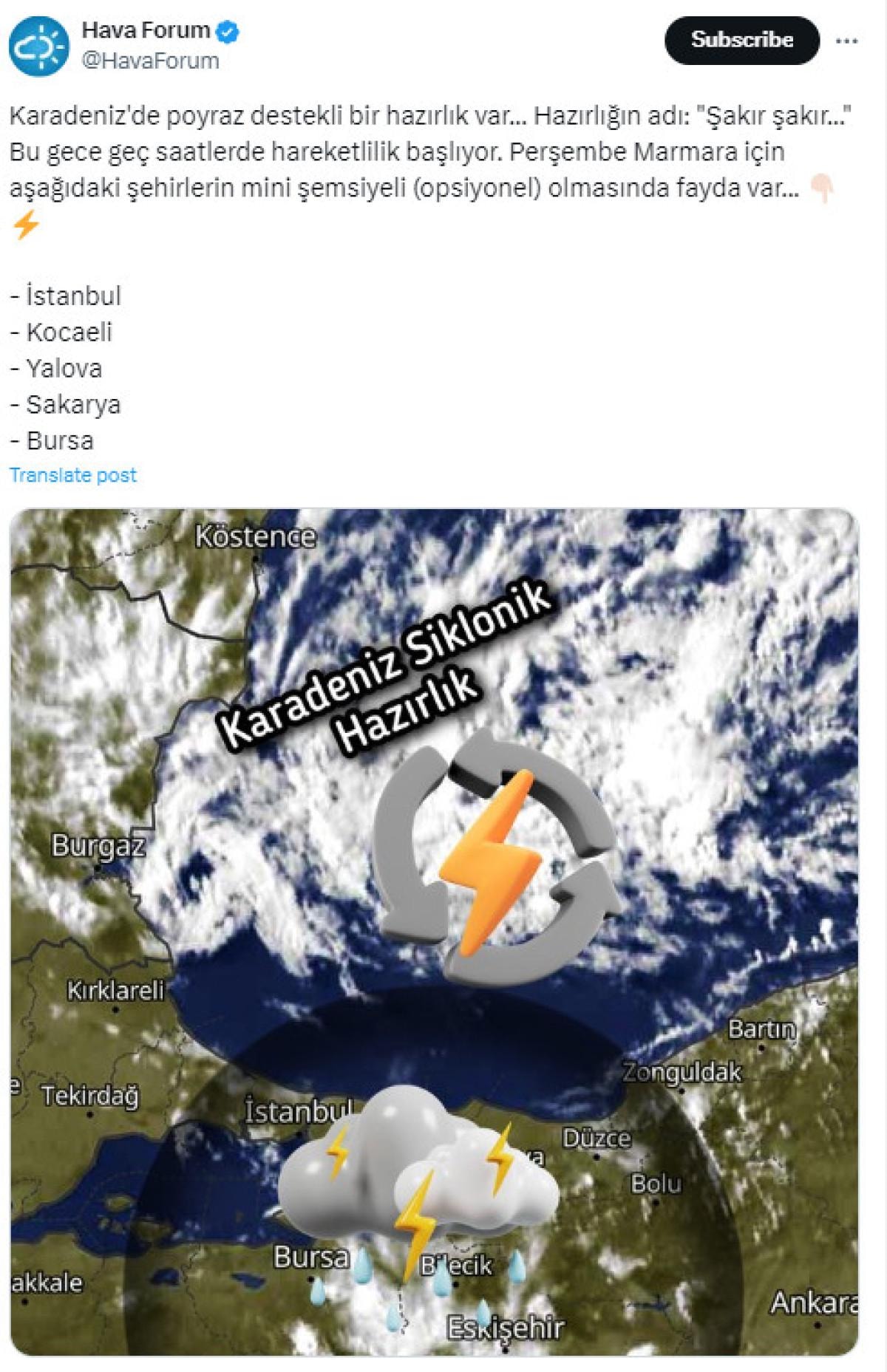 "Karadeniz'de poyraz destekli bir hazırlık var... Hazırlığın adı: "Şakır şakır..." Bu gece geç saatlerde hareketlilik başlıyor. Perşembe Marmara için aşağıdaki şehirlerin mini şemsiyeli (opsiyonel) olmasında fayda var...