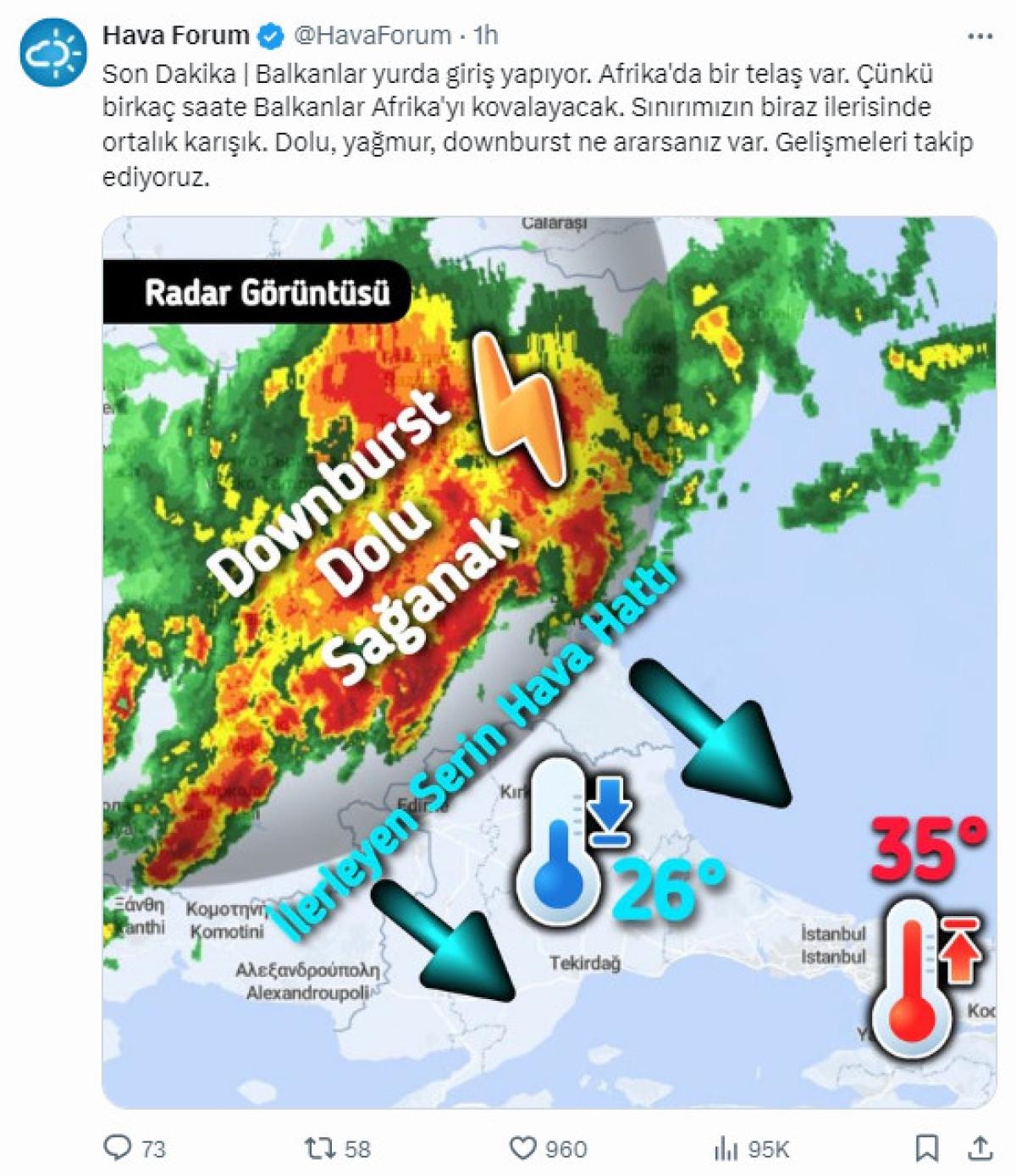Meteoroloji kaynağı Hava Forum, X hesabından Balkanlardan yurdumuza giriş yapan serin havayı duyurdu.