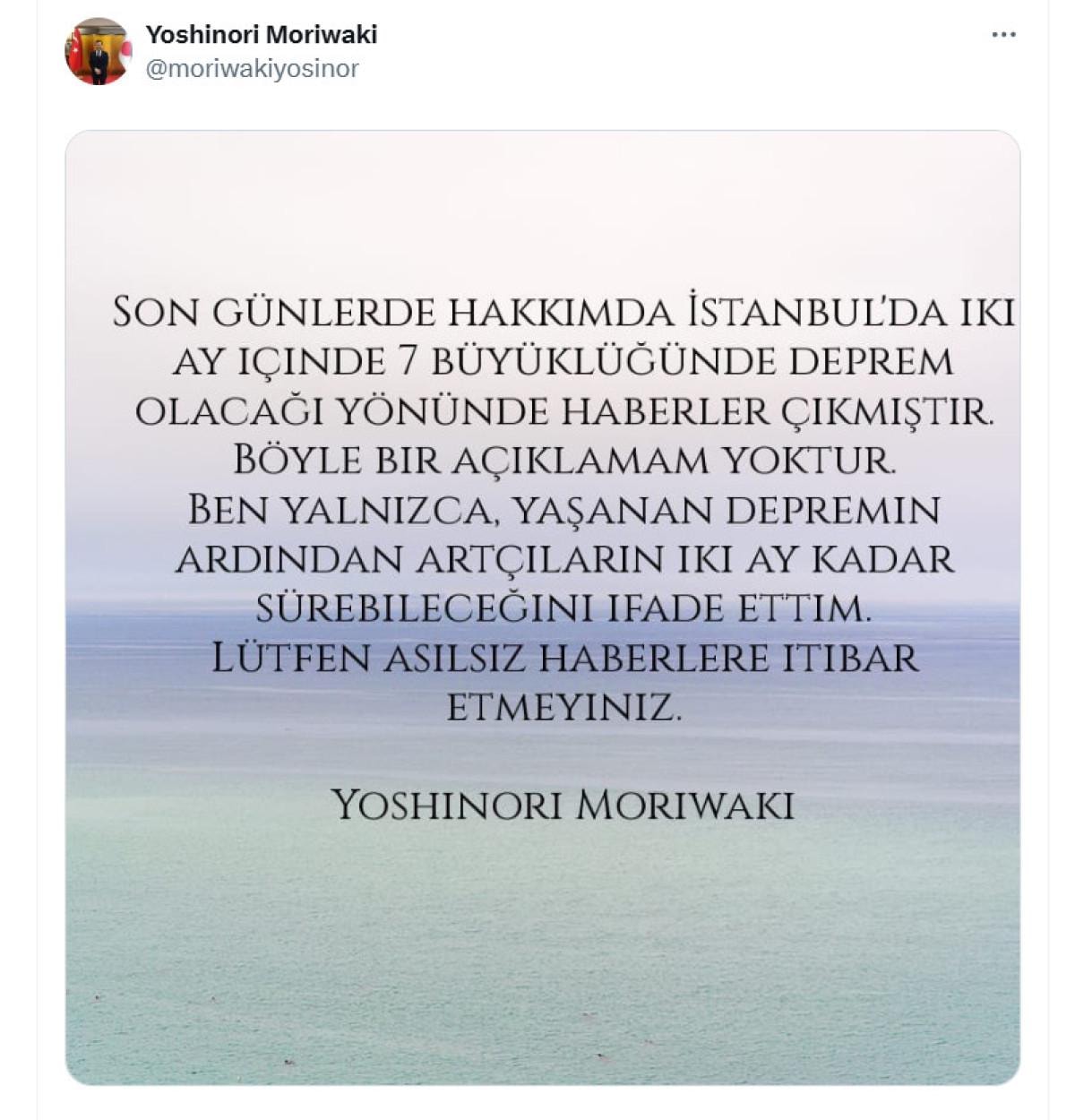 Japon Deprem Uzmanı Yoshinori Moriwaki'nin bir TV programında, İstanbul'daki iki ay içerisinde 7 büyüklüğünde bir deprem olacağını ifade ettiği iddia edildi.