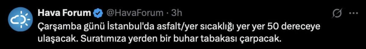 “Çarşamba günü İstanbul'da asfalt/yer sıcaklığı yer yer 50 dereceye ulaşacak. Suratımıza yerden bir buhar tabakası çarpacak.”